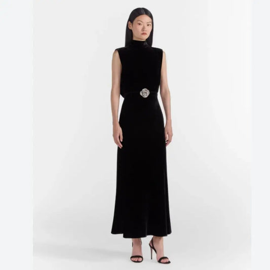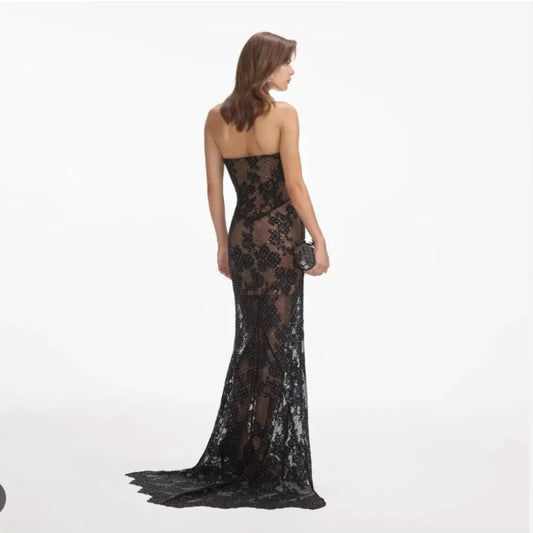 SELF PORTRAIT BLACK RHINESTONE LACE BANDEAU MAXI GOWN