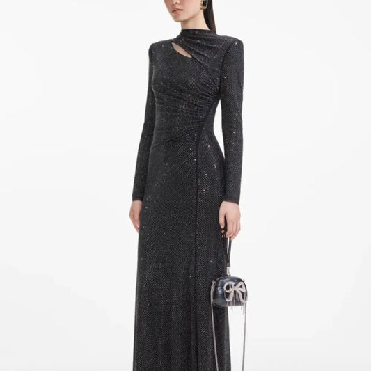 Self Portrait Black Rhinstone Mesh Cut Out Longsleeve Maxi Dress