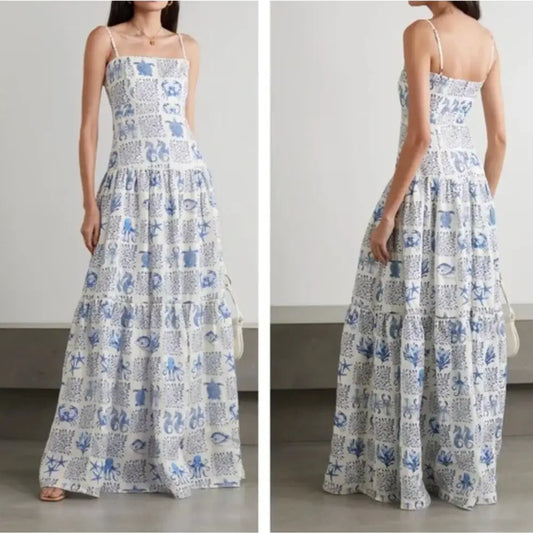 Agua by Agua Bendita Lima Tiered Printed Linen Maxi Dress in Blue